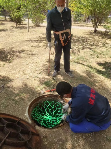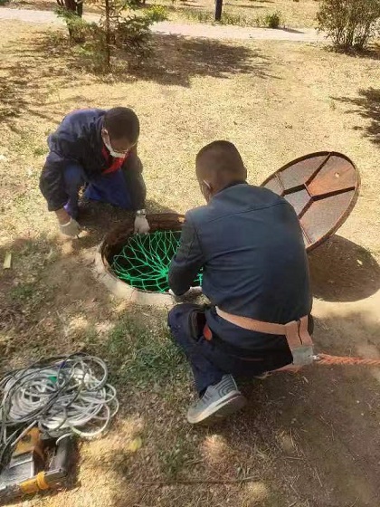 安裝現(xiàn)場,工作人員打開井蓋通風(fēng),在用氣體檢測儀檢測井內(nèi)的氣體符合作業(yè)條件后,工作人員綁好安全帶用電鉆在井壁上鉆孔,釘入尾端帶鉤的膨脹螺栓,擰緊固定后將防墜網(wǎng)掛到掛鉤上,一張防墜網(wǎng)就安裝完成?,F(xiàn)場工程師傅每完成一個(gè)防墜網(wǎng)的安裝,在確保安全的情況下,都會(huì)親身踩試檢驗(yàn),確保安裝牢固。